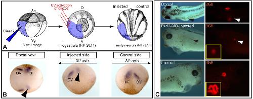 2 was injected at the eight-cell stage into the left V2 blastomere. Photoactivation of diazo-2 was performed at NF stage 11, and pax8 expression was analyzed at