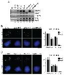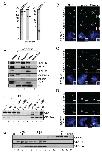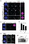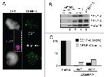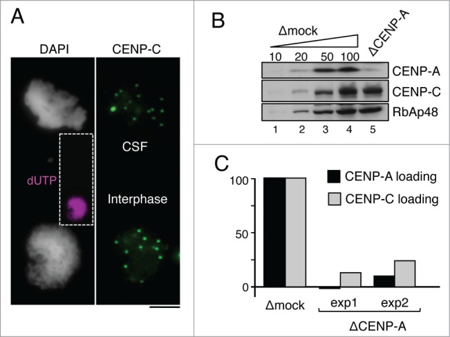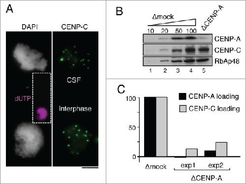 Figure 3. De novo loading of CENP-C following CENP-A incorporation in interphase. (A) Representative image of a pair used for analysis of CENP-C loading. CENP-C signals (green) from a mass of CSF chromosomes (top) are compared with those from an interphase nucleus (bottom), the latter already replicated as indicated by incorporation of dUTP (inset in magenta). Scale bar, 10 μm. (B) Increasing amounts of mock-depleted CSF extract (Δmock), expressed as percentage, and a CENP-A depleted extract (ΔCENP-A), were analyzed side by side to estimate the extent of depletion. RbAp48 is used as loading control. (C) Quantification of CENP-A loading (black bars) and CENP-C loading (gray bars) in CENP-A depleted extracts relative to the corresponding mock depleted extract using the loading assay described in the main text. At least 250 centromeres from more than 10 pairs as the one shown in (A) were measured for each condition in 2 independent experiments (exp1 and exp2).