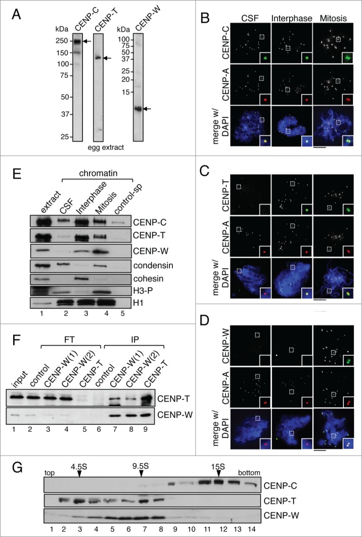 Figure 1. CENPC, CENP-T and CENP-W are recruited to chromatin at different times. (A) Immunoblot analysis of an egg extract with the indicated antibodies. For CENP-W, 2 different antibodies were raised, CENP-W(1) and CENP-W(2) (see Methods for description). While both worked for immunoprecipitation (see Fig. 1F), CENP-W(1) worked best for immunoblot and immunofluorescence. (B-D) Immunofluorescence analysis of CSF (unreplicated) chromosomes, interphase nuclei and mitotic (replicated) chromosomes with antibodies against CENP-C (B), CENP-T (C) and CENP-W (D), in green, and Cy3-labeled anti-CENP-A in red to label centromeres. DNA was counterstained with DAPI (blue). Colored images are shown for the insets and the merge with DAPI while single antibody stainings appear as gray scale images. Scale bar is 10μm. (E) Immunoblot analysis of chromatin assembled in CSF, interphase and mitotic extracts and purified by centrifugation through a sucrose cushion. Chromatin purified in the same way from a mock assembly reaction without sperm serves as control (control-sp, lane 5). Cohesin (Rad21) is a marker for interphase chromatin whereas condensin (CAP-G) and phospho H3 (H3-P) are present in CSF and mitotic chromatin. Histone H1 is used as loading control. (F) Immunoprecipitates (IP) obtained from soluble egg extracts were analyzed by immunoblot together with aliquots of the flow through (FT) from each reaction and of the input extract (1%). Immunoprecipitation with non-immune rabbit IgG was used as control. (G) A soluble egg extract was fractionated on a sucrose gradient (5-20% sucrose) and analyzed by immunoblot. The sedimentation coefficients of the major peaks of CENP-T, CENP-W and CENP-C are indicated.