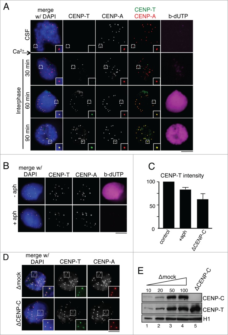 Figure 2. Requirements of CENP-T recruitment to interphase centromeres. (A) Time course analysis of CENP-T (green) recruitment to centromeres marked with Cy3-labeled anti-CENP-A (red). DNA replication is followed by incorporation of biotin-dUTP (magenta) and DNA is counterstained with DAPI (blue). The CENP-T signals at t = 30 min do not overlap with centromeres and are likely background. (B) Interphase nuclei assembled in the presence or absence of aphidicolin were analyzed with antibodies against CENP-T (green) and CENP-A (red). No incorporation of biotin-dUTP (magenta) can be detected in the presence of aphidicolin. (C) Intensity of CENP-T signals at centromeres of nuclei assembled under the indicated conditions. At least 200 centromeres were measured in 3 independent experiments per condition. Intensities were normalized to the mean value of the corresponding control experiment (no aphidicolin or mock-depletion). Bars represent mean± SEM. (D) Immunofluorescence analysis of CENP-T (green) localization in replicated interphase nuclei assembled in the presence (Δmock) or absence of CENP-C (ΔCENP-C). Centromeres are stained with Cy3-labeled anti-CENP-A (red). Scale bars, 10 μm. (E) Immunoblot analysis of CENP-C depleted extracts used in (D). Increasing amounts of mock-depleted CSF extract (Δmock), expressed as percentage, and extracts depleted from the indicated proteins were analyzed side by side by immunoblot. H1 was used as loading control.