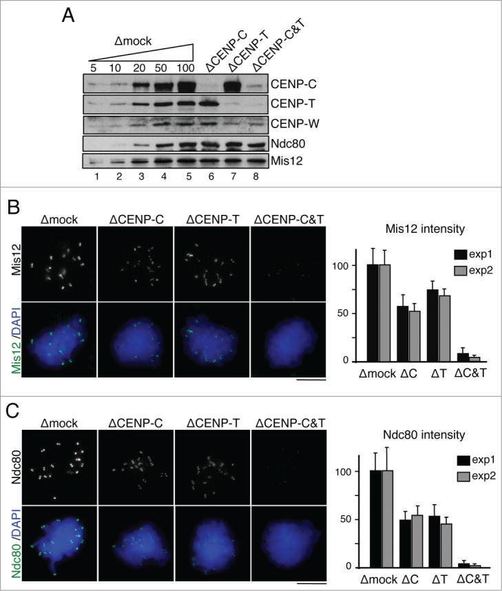 Figure 6. CENP-C and CENP-T/W contribute to kinetochore assembly. (A) Immunoblot analysis of the extracts used to assemble the chromosomes shown in (B) and (C). (B-C) Representative examples of chromosomes assembled in mock depleted extracts and extracts lacking CENP-C, CENP-T or both, and stained with antibodies against Mis12 (B) and Ndc80 (C). Quantification of total fluorescence in dots per chromosome mass is shown in the graphs on the right. Bars represent mean± SD. Between 10 and 20 nuclei per condition were measured in 2 independent experiments (exp1 and exp2).