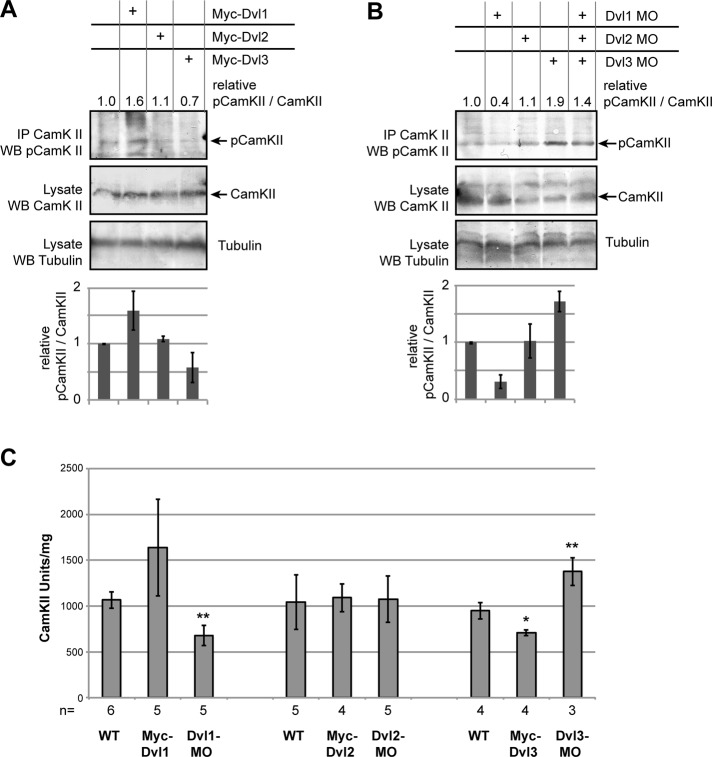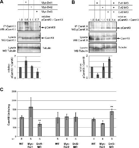 FIGURE 4:. Dvl1 activates CamKII in Xenopus embryos. (A) Immunoblotting for active CamKII-pT286 showed that Myc-Dvl1, but not Myc-Dvl2, enhanced CamKII phosphorylation, whereas Myc-Dvl3 reduced pCamKII levels in the embryos. (B) Knockdown of individual Dvl isoforms using specific antisense morpholino oligonucleotides yielded the inverse result. Dvl1 morphants showed reduced and Dvl3 morphants showed increased pCamKII levels, whereas Dvl2 knockdown did not affect pCamKII. In triple Dvl-morphant embryos, increased pCamKII levels were again observed. Ratios of pCamKII/CamKII in A and B were determined densitometrically relative to uninjected controls. Values noted above the respective lanes represent measurements of the blots shown; bar graphs below show the average ± SD from three independent experiments. (C) Xenopus embryos were injected as indicated, and CamKII kinase activity was measured. The graph represents the average activity from at least three independent experiments (average ± SEM); injections and number of experiments (n) are given below the graph. Asterisks indicate statistically significant deviation of means from corresponding wild-type levels (*p > 0.1, **p > 0.05, Wilcoxon rank-sum test). |