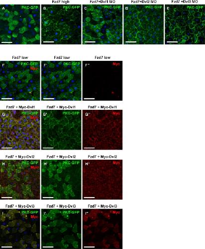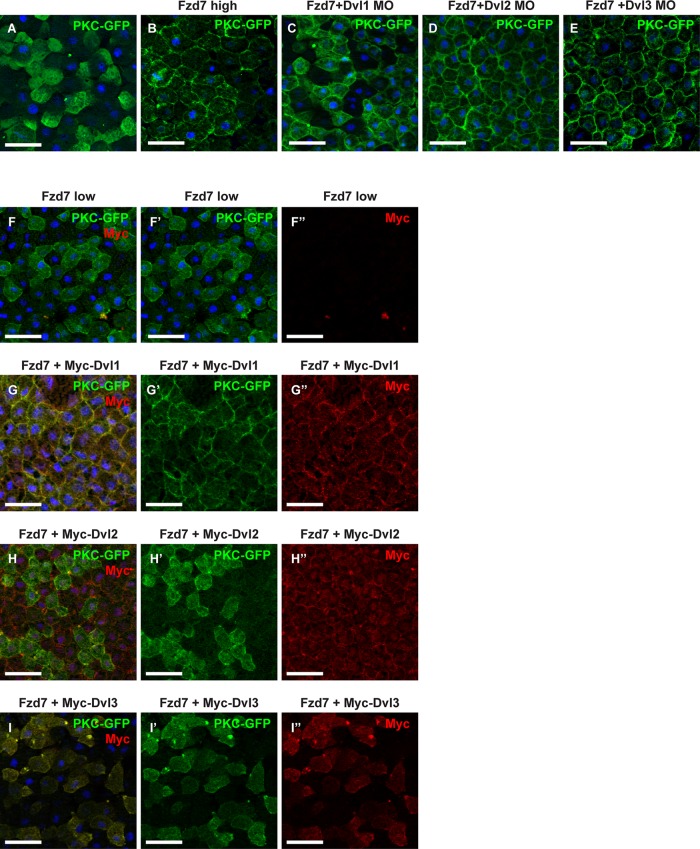FIGURE 5:. Dvl1 is required for activation and membrane translocation of PKC in Xenopus embryos. Xenopus embryos were injected with 500 pg of pkcα-gfp RNA and coinjected as indicated above the images. Animal caps were prepared at stage 10 and immunostained as indicated. Nuclei were stained with Hoechst 33258 (blue). Images show representative results of at least three independent experiments with a minimum of six Animal Caps per experiment. Scale bars, 50 μm. (A) PKCα-GFP predominantly localized to the cytoplasm in Xenopus animal caps. (B) Coinjection of 1 ng of fz7 RNA induced translocation of PKCα-GFP to the plasma membrane, indicating activation of PKC. (C) Overexpression of Fz7 was less effective in inducing PKCα-GFP translocation in Dvl1-morphant embryos. Knockdown of Dvl2 (D) or Dvl3 (E) did not impair Fz7-induced PKC-GFP translocation. Injection of subeffective amounts of fz7 RNA (300 ng) did not alter PKCα-GFP localization (F, Fâ²) compared with animal cap cells expressing only PKCα-GFP (A). Coinjection of 200 pg of myc-dvl1 RNA induced robust membrane translocation of PKCα-GFP (G, Gâ²). The tissue was coimmunostained against the Myc epitope, showing that Myc-Dvl1 predominantly localized to the plasma membrane and colocalized with PKCα-GFP (Gâ²â²). Coinjection of 200 pg of myc-dvl2 RNA was not sufficient to induce translocation of PKCα-GFP to the plasma membrane (H, Hâ²). Myc-Dvl2 was detected in the cytoplasm and at the plasma membrane (Hâ²â²). Coinjection of 200 pg of myc-dvl3 RNA also failed to induce membrane translocation of PKCα-GFP (I, Iâ²). Myc-Dvl3 predominantly localized in the cytoplasm and partially formed large aggregates, which were also positive for PKCα-GFP (Iâ²â² and I). |
