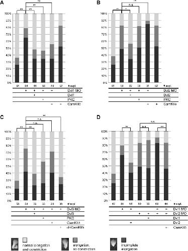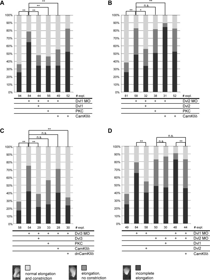 FIGURE 6:. CamKIIδ acts downstream of Dvl1 in Xenopus convergent extension movements. Xenopus embryos were injected at the four-cell stage in the marginal zone of both dorsal blastomeres as indicated. CE movements in the dorsal mesoderm were monitored by elongation and constriction of Keller open-face explants. The average percentage of explants showing full elongation and constriction (light gray), elongation but impaired constriction (medium gray), or incomplete elongation (dark gray) from at least three independent experiments is shown. Asterisks indicate statistically significant deviations (**p > 0.99, *p > 0.95, χ2 test). (A) Dvl1 knockdown predominantly inhibited explant elongation. The Dvl1-knockdown phenotype was rescued by overexpression of Dvl1, PKCα, or CamKIIδ; overexpression of CamKIIδ induced moderate elongation and constriction defects. (B) Dvl2 knockdown resulted in a weaker inhibition of elongation but a significant increase in constriction defects. The Dvl2-knockdown phenotype was not rescued by PKCα or CamKIIδ but was rescued by coinjection of a morpholino-insensitive myc-dvl2 RNA. (C) The Dvl3 knockdown phenotype was similar to the phenotype in Dvl2-depleted explants. Dvl3 MO knockdown was rescued by Dvl3 and partially but statistically not significantly by PKC. CamKIIδ was not able to rescue Dvl3 depletion, but coinjection of an RNA encoding dnCamKIIδ rescued CE movements. (D) Dvl2 overexpression rescued the Dvl1-morphant phenotype, but not vice versa. Explants from Dvl1/Dvl2 double-morphant embryos showed a more severe phenotype than the single knockdowns. Overexpression of CamKIIδ significantly rescued explant elongation but not constriction, thus yielding an explant phenotype highly similar to explants from Dvl2 morphants. |