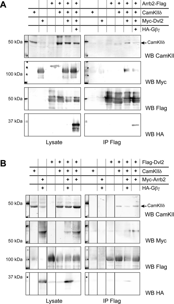 FIGURE 1:. CamKIIδ interacts with the Arrb2-Dvl2-Gβγ complex. (A) The interaction was confirmed by coimmunoprecipitation of the respective proteins overexpressed in HEK 293T cells. CamKIIδ coimmunoprecipitated with Flag-Arrb2 only in the presence of Dvl2; in cells coexpressing Gβγ, less Myc-Dvl2 and correspondingly less CamKIIδ was detected in the immunoprecipitate. (B) CamKIIδ was coimmunoprecipitated with Flag-Dvl2 from HEK 293T cells; coexpression of Myc-Arrb2 and Gβγ reduced the overall expression levels of CamKIIδ and the amount coprecipitated with Flag-Dvl2; coexpression of Myc-Arrb2 slightly enhanced the interaction of Flag-Dvl2 with CamKIIδ. |