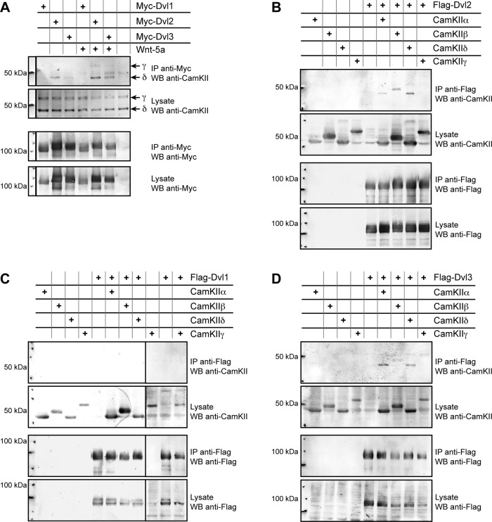 FIGURE 2:. Differential interaction between CamKII and Dvl isoforms. (A) Overexpressed Myc-Dvl1, Myc-Dvl2, and Myc-Dvl3 were immunoprecipitated from HEK293T cells and analyzed for coprecipitation of endogenous CamKII. No binding of CamKII to Dvl1 was detectable. CamKII interacted with Dvl2 and very weakly with Dvl3 in unstimulated cells; both interactions were increased upon stimulation with Wnt-5a–conditioned medium for 30 min. To define further the specificity of interaction between CamKII and Dvl isoforms, CamKIIα, CamKIIβ, CamKIIδ, and CamKIIγ were coexpressed with Flag-Dvl2 (B), Flag-Dvl1 (C), or Flag-Dvl3 (D) in HEK 293T cells. The Flag-tagged Dvl isoforms were immunoprecipitated using immobilized anti-Flag antibodies. (B) Flag-Dvl2 bound and coprecipitated CamKIIα, CamKIIβ, and CamKIIδ but not CamKIIγ. (C) Neither CamKIIα nor β, δ, or γ coprecipitated with Flag-Dvl1. (D) Flag- Dvl3 interacted with CamKIIα and CamKIIδ, and weak bands of CamKIIβ and γ were also observed in Dvl3 immunoprecipitates. |