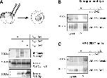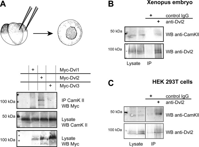 FIGURE 3:. Endogenous CamKII interacts with Dvl2 in Xenopus embryos. (A) Xenopus embryos were injected as illustrated in the two dorsal blastomeres at the four-cell stage with RNA encoding Myc-Dvl1, Myc-Dvl2, or Myc-Dvl3. At early-gastrula stage (NF stage 10.5), endogenous CamKII was captured by immunoaffinity and the immunoprecipitates probed for the presence of the Myc-tagged Dvl isoforms (A). Endogenous CamKII coprecipitated with endogenous Dvl2 from Xenopus embryos (B) and from HEK 293T cells (C), confirming the physical interaction. |