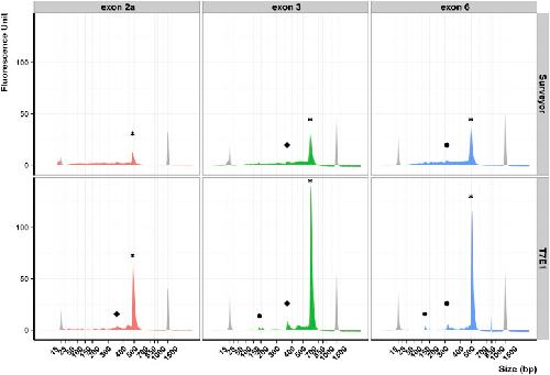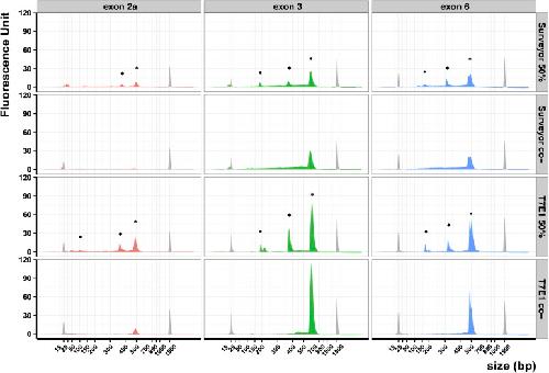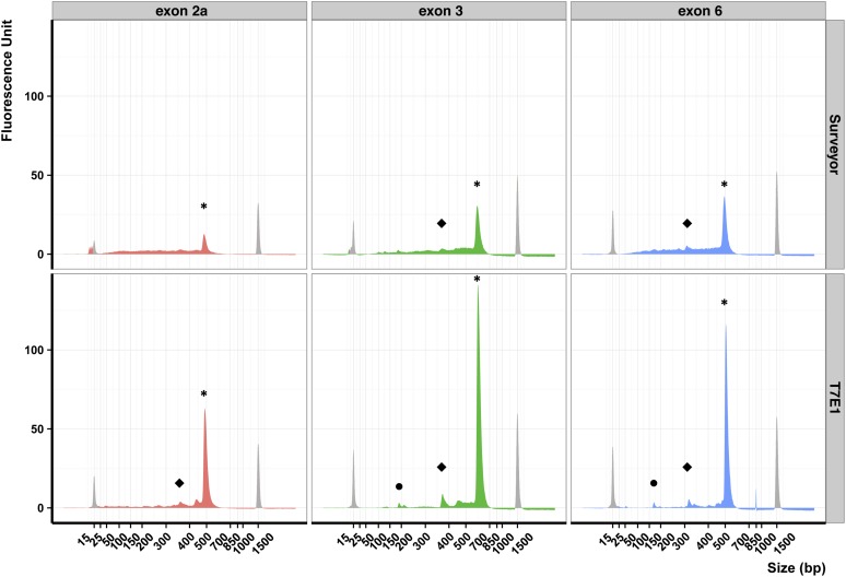 Figure 2. Limits of sensitivity of Surveyor and T7E1 on different templates. Electropherograms obtained on DNA products from exon 2a, 3, and 6 after Surveyor or T7E1 digestion. The Surveyor and T7E1 assays were made on a mix composed of 5% 20-bp deletion mutants and 95% of wild-type DNA. Peaks colored in gray correspond to the internal molecular weight standards: the small molecular weight marker measures 15 bp and the large measures 1500 bp. Peaks labeled with an asterisk (*) correspond to uncleaved DNA, peaks labeled • and ⬥ correspond to cleaved DNA heteroduplex.
