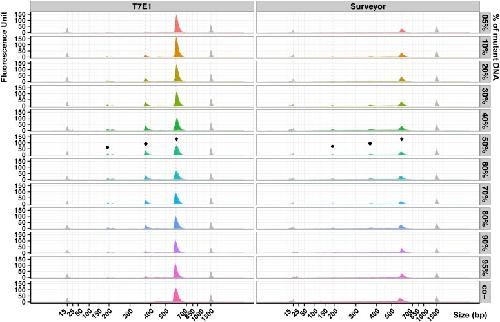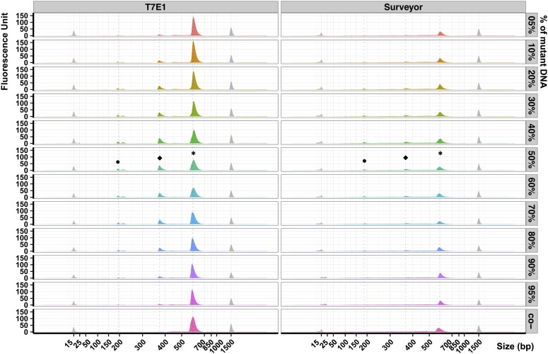 Figure 3. Comparison of Surveyor and T7E1 sensitivity. Electropherograms obtained on exon 3 DNA products after Surveyor or T7E1 digestion. The percentage indicated on the right corresponds to the quantity of mutant DNA in a pool of mutant and wild-type DNA. The Surveyor and T7E1 negative controls (co-) correspond to reactions made using mutant DNA only (100%). Peaks colored in gray correspond to the internal molecular weight standards: the small molecular weight marker measures 15 bp and the large measures 1500 bp. Peaks labeled with an asterisk (*) correspond to uncleaved DNA, peaks labeled • and ⬥ correspond to cleaved DNA heteroduplex.