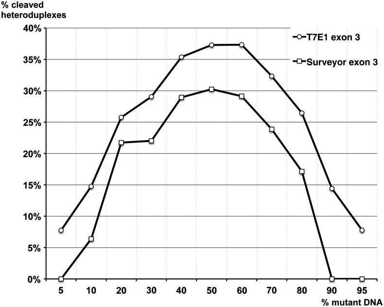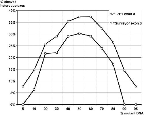 Figure 4. Quantification of Surveyor and T7E1 efficiency and sensitivity. This graph shows the fraction of cleaved products from all products (y-axis) in a mixture composed of various quantities of deletion mutants of exon 3 in a population of mutant and wild-type DNA molecules (x-axis). Open circles correspond to T7E1 digestion products, open squares correspond to Surveyor digestion products.