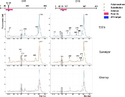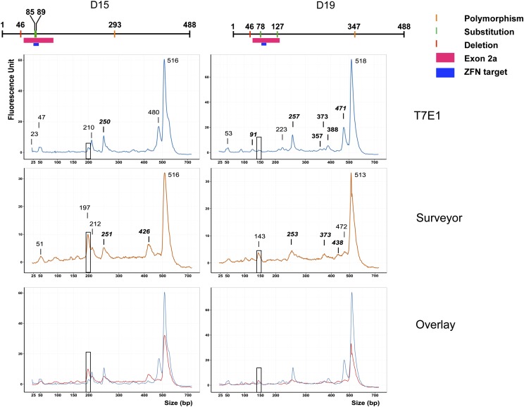 Figure 5. Comparison of Surveyor and T7E1 efficiencies on point mutations. The top of this figure presents schematics of the D15 and D19 sequence differences in comparison with the wild-type smn exon 2a. The electrophoregrams obtained on D15 or D19 DNA products are presented from top to bottom in the following order: after T7E1 digestion, after Surveyor digestion, and an overlay of the two conditions. The size of the peaks is given in base pairs. Only peaks called by the software were labeled. Peaks matching the size of a partial digestion product are written in bold italics. Boxed peaks are discussed in the text. The portions of the small and large markers have been omitted for clarity.
