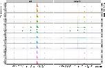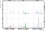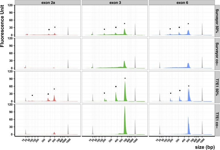 Figure 1. Comparison of Surveyor and T7E1 efficiencies. Electropherograms obtained on three different DNA products (exon 2a, exon 3, and exon 6) treated using either the Surveyor (top two rows) or T7E1 enzyme (bottom two rows). The Surveyor and T7E1 assays were made on a 50% mix of wild-type and 20-bp deletion mutants. For the Surveyor and T7E1 negative controls (co-), we prepared individual reactions using only wild-type or mutant DNA and pooled the products before electrophoresis. Peaks colored in gray correspond to the internal molecular weight standards: the small molecular weight marker measures 15 bp and the large measures 1500 bp. Peaks labeled with an asterisk (*) correspond to uncleaved DNA, peaks labeled • and ⬥ correspond to cleaved DNA heteroduplex.