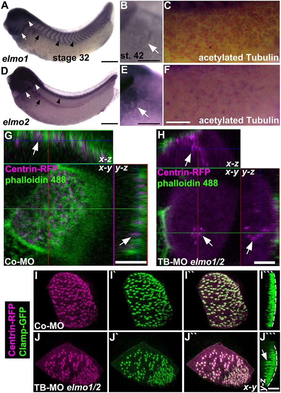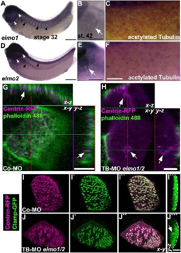 Fig. 2. ELMO1 and ELMO2 are expressed in ciliated organs and are required for ciliogenesis in Xenopus. (A-F) Expression of elmo1 (A-C) and elmo2 (D-F) in the head, branchial arches (white arrow in A,D), otic vesicle (white arrowhead), pronephric kidney (black arrow), throughout the epidermis at stage 32, and in the pronephric tubules (white arrow in B,E) at stage 42 of Xenopus development. In addition, elmo1 is expressed in the intersomitic vessels and elmo2 in the spinal cord at stage 32 (black arrowheads). Expression of elmo1 and elmo2 colocalised with acetylated Tubulin marking cilia at stage 32 (C,F; see also supplementary material Fig. S5C). (G,H) Xenopus embryos (stage 32) injected with TB-MO elmo1 and TB-MO elmo2 (each 4â