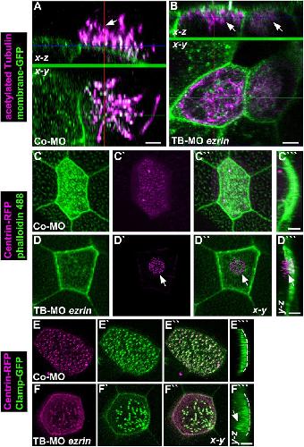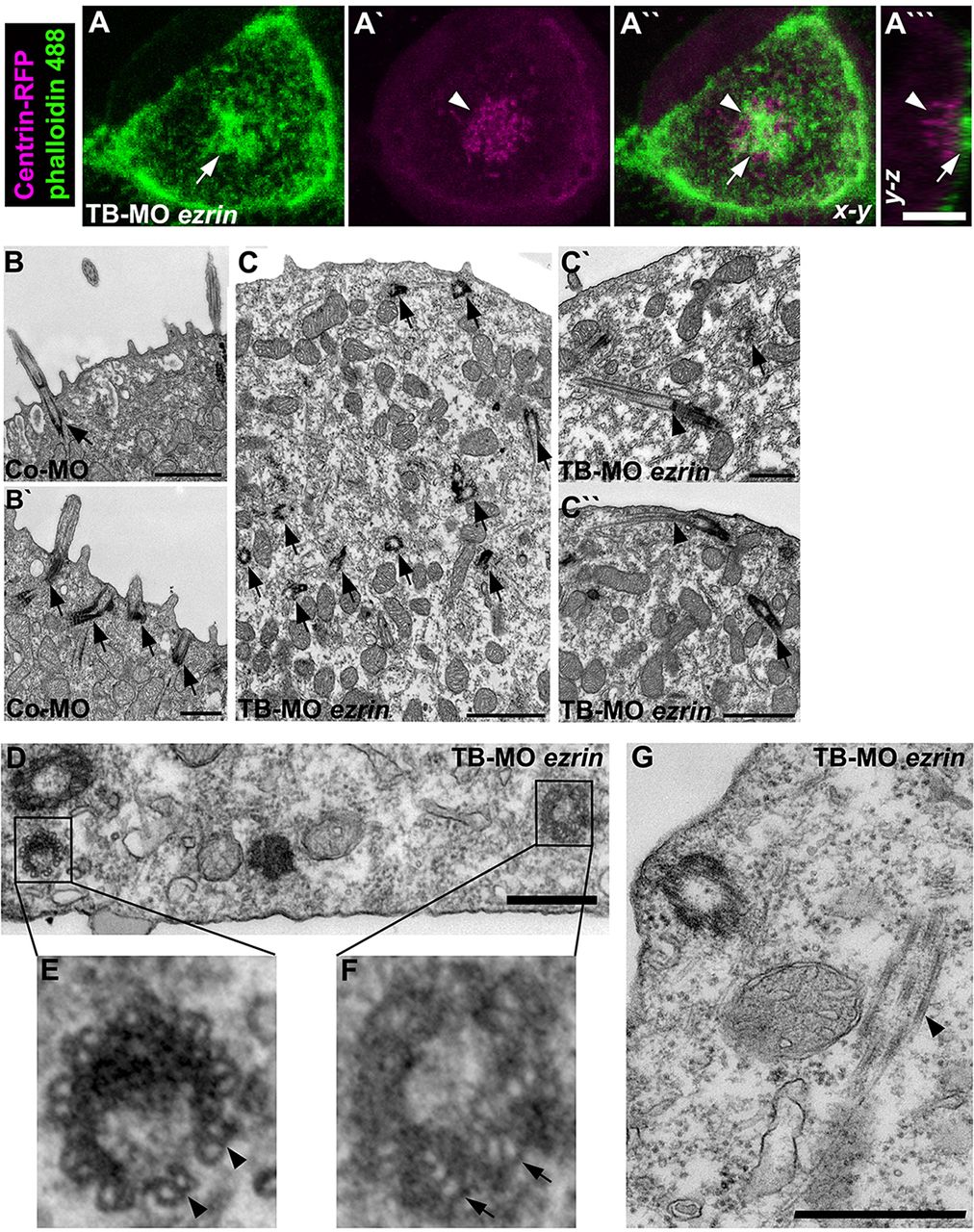 ng) and stained with phalloidin 488. (B-Câ²) TEM analysis revealed basal body migration and docking defects (arrows) and intracellular axoneme formation (arrowheads) in Xenopus embryos (stage 32) injected with TB-MO ezrin (8â