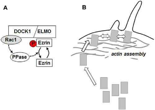 Fig. 8. Model illustrating ELMO-DOCK1-Rac1 and their interaction with Ezrin and the effects on basal body migration and spacing in MCCs. (A) The ELMO-DOCK1 complex localises to the ciliary basal body and acts as bipartite guanine nucleotide exchange factor for Rac1. Rac1 in turn dephosphorylates Ezrin via an unknown phosphatase (PPase). Dephosphorylated Ezrin does not bind to actin filaments, whereas phosphorylated Ezrin serves as a linker between the basal body and actin filaments. (B) Constant turnover of phosphorylated Ezrin regulated by ELMO-DOCK1-Rac1 is necessary to promote basal body migration along actin filaments (arrows) and for basal body docking to the membrane and spacing (double arrows) with assembly of the apical and subapical actin network.