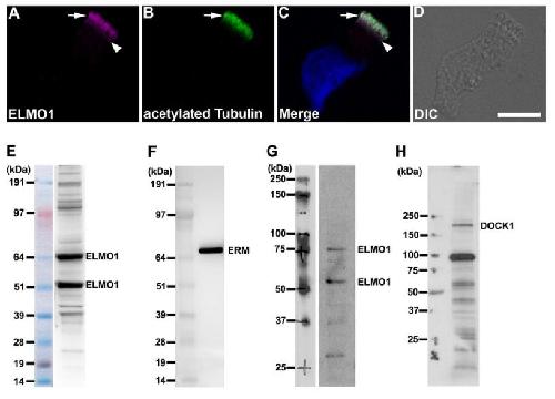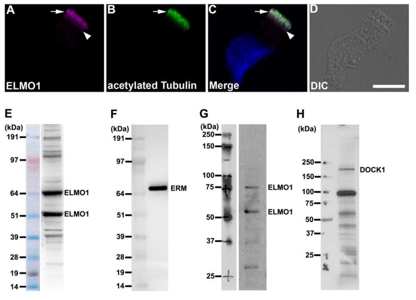 (A-D) Human respiratory epithelial cells from controls were double-labelled with antibodies directed against ELMO1 (magenta) and acetylated Tubulin (green). ELMO1 localizes along the ciliary axonemes (white arrow) and the basal bodies (white arrowhead). The nucleus is stained with Hoechst33342 (blue). Immunoblots of human respiratory epithelial cell lysates and MDCK lysates validates the utilized ELMO1 antibody with the appropriate double bands according to the manufacturer (E,G), Ezrin (F) and DOCK1 (H) antibodies. Scale bar, 10 μm (D).
