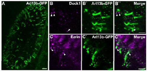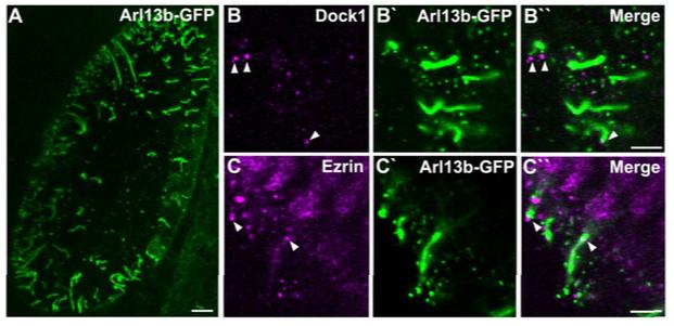 of Tg(actb2:Mmu.Arl13b-GFP) embryos at 48 hpf. (B-B``) Dock1 is expressed at the basal bodies (white arrowheads) in the otic vesicle of Tg(actb2:Mmu.Arl13b-GFP) embryos at 48 hpf. (C-C``) Ezrin is expressed at the basal bodies (white arrowheads) and the ciliary axonemes in the otic vesicle of Tg(actb2:Mmu.Arl13b-GFP) embryos at 48 hpf. Scale bars, 5 μm (A,B``,C``).
