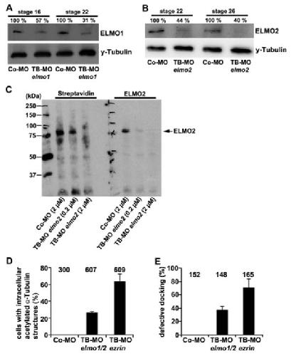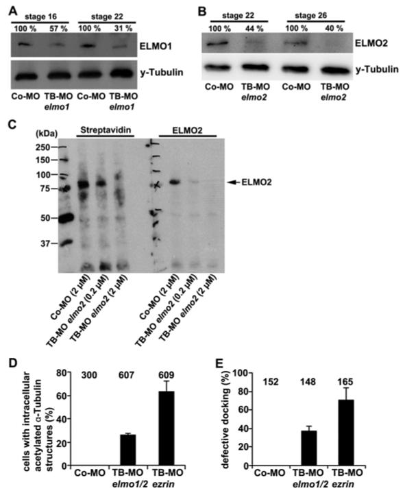 (A) Immunoblot of Xenopus lysates (stage 16 and 22) after injection of TB-MO elmo1 (8 ng) into both blastomeres of two-cell stage Xenopus embryos indicates strong reduction of ELMO1 expression compared to Co-MO (8 ng) injected embryos. Anti-γ-Tubulin immunoblot served as loading control. (B) Immunoblot of Xenopus lysates (stage 22 and 26) after injection of TB-MO elmo2 (8 ng) into both blastomeres of two-cell stage Xenopus embryos indicates strong reduction of ELMO2 expression compared to Co-MO (8 ng) injected embryos. Anti-γ-Tubulin immunoblot served as loading control. (C) In vitro translated Xenopus ELMO2 protein was detected via immunoblotting by Streptavidin or ELMO2 antibody. ELMO2 protein level decreased in the presence of 0.2 μM and 2 μM of the TB-MO elmo2. Immunofluorescence-based quantification of cells with intracellular acetylated ï¡-Tubulin-positive structures (D) and cells with defective centriole docking (E) of TB-MO elmo1/elmo2 (each 4 ng) and TB-MO ezrin (8 ng) injected Xenopus embryos compared to Co-MO (8 ng) injected Xenopus embryos at stage 32. Numbers indicate