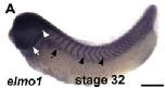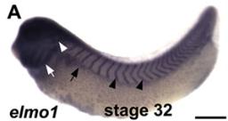 elmo2 (engulfment and cell motility 2) gene expression in Xenopus laevis embryo, assayed via in situ hybridization, NF stage 32, lateral view, anterior left, dorsal up.