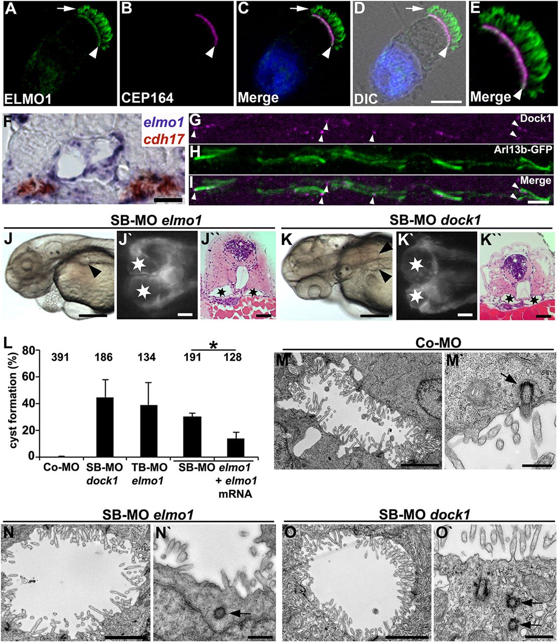 pg). There was significant prevention of cyst formation upon co-injection of elmo1 mRNA (*Pâ¤0.05). The number of individual embryos analysed is indicated above each bar. (M-Oâ²) Analysis of electron micrographs revealed basal body docking defects (arrows) in 48â