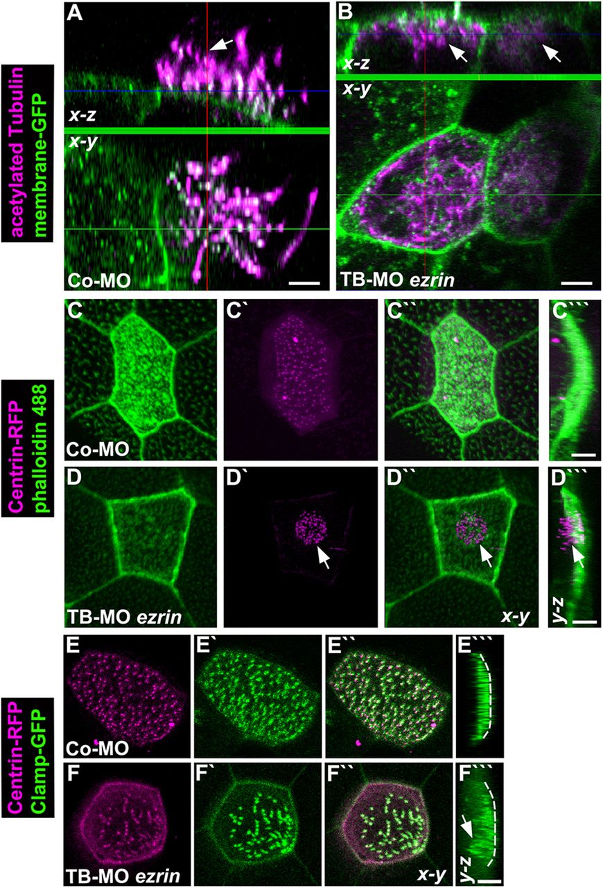 Fig. 5. Ezrin depletion leads to impaired actin remodelling and intracellular ciliary axoneme formation in Xenopus MCCs. (A-Aâ´) Increased actin accumulation (arrows) directly above the cluster of Centrin-RFP-labelled basal bodies (arrowheads) in Xenopus embryos (stage 32) injected with TB-MO ezrin (8â