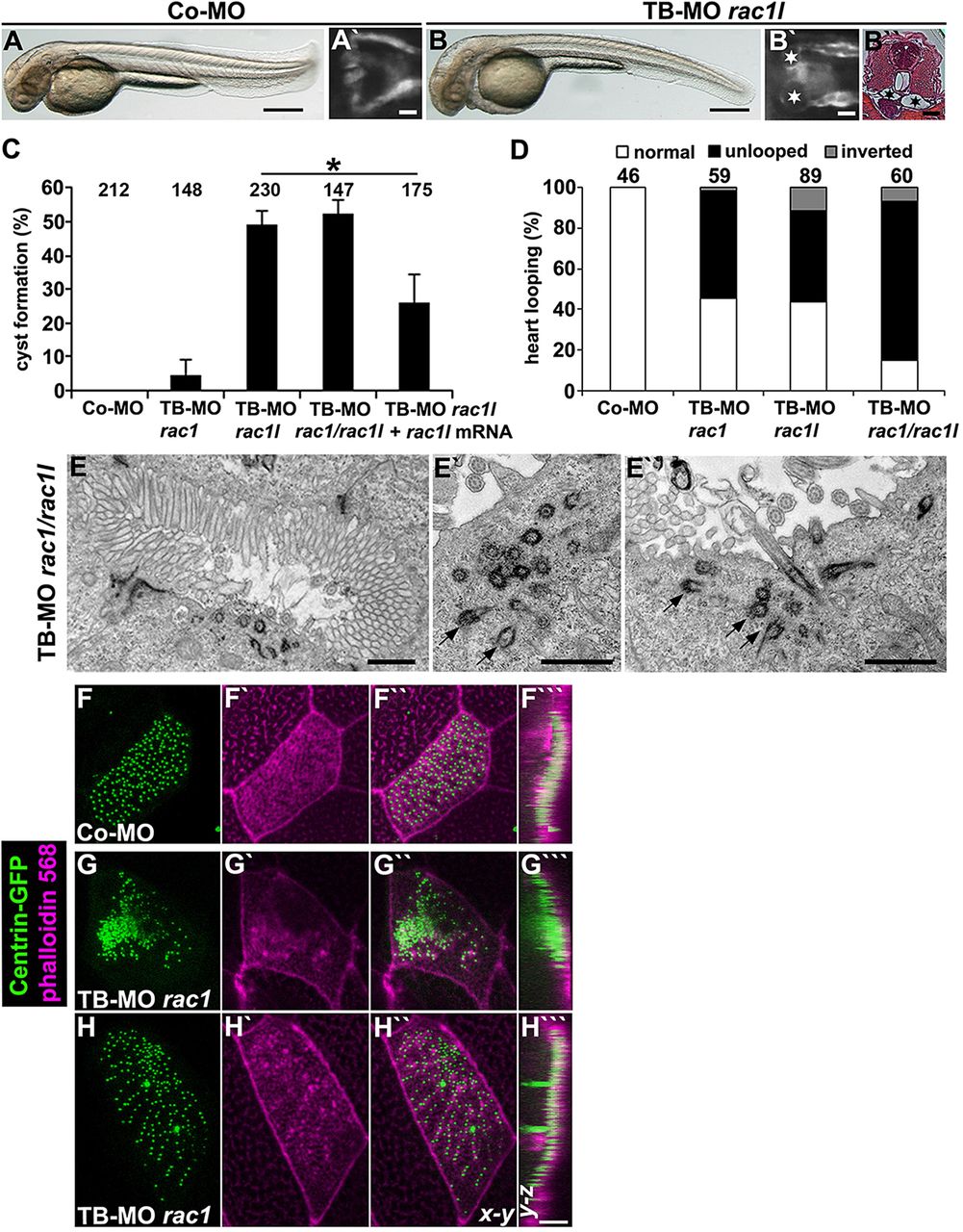 ng) and centrin-GFP mRNA showed normal basal body docking and basal body distribution at stage 32; embryos were colabelled with phalloidin 568 (magenta). (G-Hâ´) Xenopus embryos (stage 32) injected with TB-MO rac1 (40â