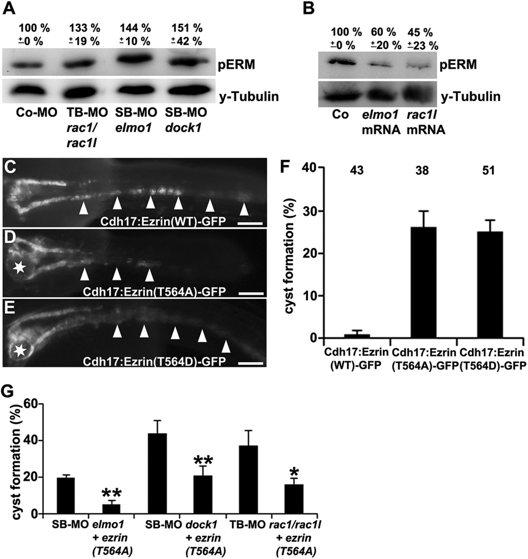 pg) as compared with control embryos. Anti-γ-Tubulin immunoblots served as a loading control. Immunoblots represent results from one of three independent experiments with similar results. (C-F) Overexpression of Ezrin by transient transgenesis demonstrates the importance of tight regulation of phosphorylation at threonine 564 for the function of zebrafish Ezrin. cadherin 17 (cdh17) promoter-driven expression of either the nonphosphorylatable T564A mutation or the phosphorylation mimetic mutant T564D caused cyst formation on the side of the pronephros where the MCCs in the mid-portion of the pronephric tubule are most affected. Arrowheads indicate the tubular mid-portion, with the cells expressing mutant Ezrin on the side of the formed cyst. The number of individual embryos analysed is indicated above each bar. (G) Quantification of pronephric cyst formation of 48â