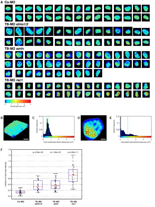 (A) Local basal body density for all recorded multiciliated skin cells in Xenopus embryos. (B) Local basal body density for a cell of a Co-MO (4 ng) injected embryo. (C) Histogram of the local basal body density in the control cell depicted in B. The green lines mark the 25 % and 75 % quantiles. (D,E) Analysis as in B,C for a cell of a TB-MO ezrin (4 ng, low dosage) injected embryo. The larger variation of the local spot density results in a wider distribution with a larger interquartile range. (F) Homogeneity of the basal body distribution measured by the interquartile range of the local spot density. Each point corresponds to one cell. The blue boxes denote the 25 % and 75 % quantile, the red line indicates the median. The p-values (computed with the two-sided Wilcoxon rank sum test) show signifcant differences to the control. Scale bars: 5μm (B,D).