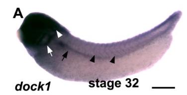 (A,B) Expression of dock1 in the head, branchial arches (white arrow), otic vesicle (white arrowhead), pronephric kidney (black arrow), throughout the epidermis at stage 32, and in the pronephric tubules (white arrow) at stage 42 of Xenopus development. (C) Expression of