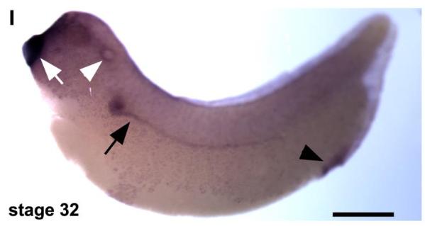ezr (ezrin) gene expression in Xenopus laevis embryo, assayed via in situ hybridization, NF stage 32, lateral view, anterior left, dorsal up.