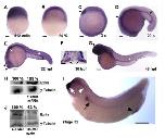 dock1 (dedicator of cytokinesis 1) gene expression in Xenopus laevis embryo, assayed via in situ hybridization, NF stage 32, lateral view, anterior left, dorsal up.