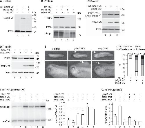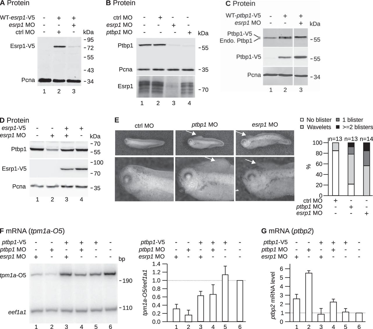 FIG 2 The knockdown of esrp1 reduces the abundance of the Ptbp1 protein. (A) An mRNA encoding a V5-tagged version of Esrp1 with the wild-type (WT) 5Ⲡregion (WT-esrp1-V5) was injected with either a control (ctrl) or the esrp1 MO in two-cell embryos. The embryos were allowed to develop until stage 15 (neurula) before protein extraction and Western blot analysis using anti-V5 and anti-Pcna (loading control) antibodies. (B) The indicated morpholinos were injected in both blastomeres of two-cell embryos. The embryos were allowed to develop until stages 28 to 30 (tail bud) before protein extraction and Western blot analysis. (C) An mRNA encoding a V5-tagged version of Ptbp1 with the wild-type 5Ⲡregion (WT-ptbp1-V5) was injected alone or in combination with the esrp1 MO in both blastomeres of two-cell embryos. The embryos were allowed to develop until stages 28 to 30 before protein extraction for Western blot analysis using anti-Ptbp1, anti-V5, and anti-Pcna (loading control) antibodies. Endo., endogenous. (D) esrp1 MO and/or an mRNA encoding a V5-tagged version of Esrp1 immune to the esrp1 MO (esrp1-V5 mRNA) was injected in both blastomeres of two-cell embryos. The embryos were allowed to develop until stage 15 before protein extraction and Western blot analysis. (E) The indicated morpholinos were injected in both blastomeres of two-cell embryos. The embryos were allowed to develop until stage 35 (tadpole), and the presence of blisters was recorded. (Left) Representative embryos (arrows point to the blisters); (right) quantification of the blister phenotype. (F) An mRNA encoding a V5-tagged version of Ptbp1 (which is immune to the ptbp1 MO) and/or the indicated morpholinos were injected in both blastomeres of two-cell embryos. The embryos were allowed to develop until stages 28 to 30. The total RNAs were extracted and quantified by semiquantitative RT-PCR with a forward primer hybridizing to the constitutive exon 8 and a reverse primer hybridizing to the nonmuscular exon 9D of tpm1a mRNA, to amplify the nonmuscular (O5) isoform (Fig. 1B). Primers specific for eef1a1 mRNAs were also used. (Left) Results of a representative experiment; (right) quantification from 3 independent experiments (mean ± SD). The tpm1a-O5/eef1a1 ratios were normalized by the ratio in the noninjected embryos in each experiment to correct for the different specific activities of the radiolabeled primers. (G) Quantification by real-time PCR of ptbp2 mRNA abundance relative to eef1a1 mRNA abundance in embryos injected with the same molecules used for the assay whose results are presented in panel F (mean ± SD from 3 independent experiments). |