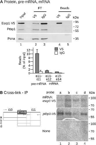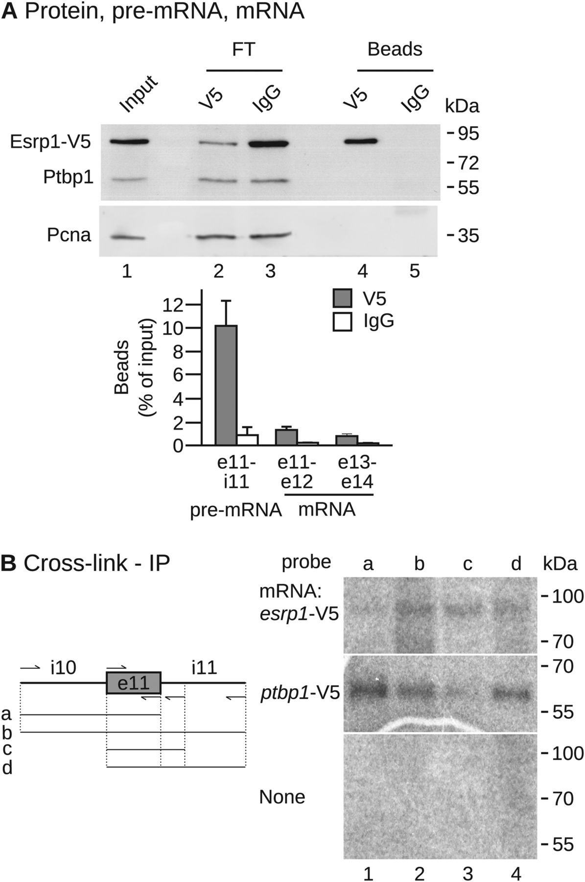FIG 6 Esrp1 binds to ptbp1 pre-mRNA. (A) An mRNA encoding a V5-tagged Esrp1 protein was injected in both blastomeres of two-cell embryos that were allowed to develop until stage 15. The V5-tagged protein was immunoprecipitated using anti-V5 antibodies or IgGs for mock immunoprecipitations. (Top) The input, the flowthrough (FT), and the immunoprecipitated fractions analyzed by Western blotting using antibodies against V5, Ptbp1, and Pcna. Equivalent amounts of the input, flowthrough, and eluates were loaded. (Bottom) Measurement of the amounts of ptbp1 pre-mRNA and mRNA in the immunoprecipitated fractions relative to the input amount using primers for the indicated intron (i) and exon (e) pairs. These immunoprecipitated fraction-to-input ratios (mean ± SD) result from 3 independent anti-V5 and mock immunoprecipitations. (B) (Left) Matrices were obtained by PCR amplification using combinations of forward and reverse primers, indicated by arrows. They were used for in vitro transcription to obtain 4 radiolabeled RNAs encompassing different fragments of intron 10, exon 11, and intron 11 of ptbp1 pre-mRNA. IP, immunoprecipitation. (Right) The in vitro transcripts were incubated in protein extracts made from embryos previously injected with esrp1-V5 mRNA (top) or ptbp1-V5 mRNA (middle) or left uninjected (bottom). After UV cross-linking and RNase treatment, the V5-tagged proteins were immunoprecipitated, electrophoresed, and revealed by autoradiography. |