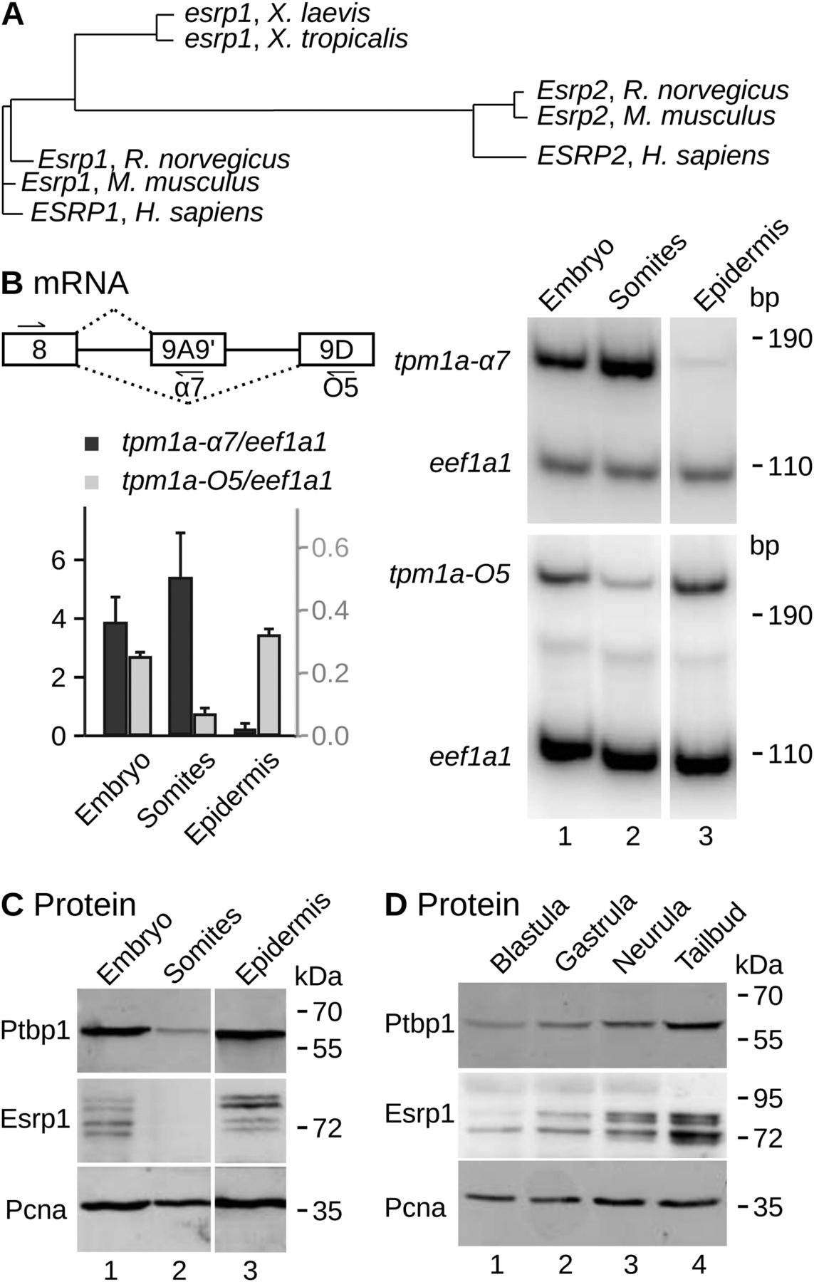 FIG 1 Coexpression of ptbp1 and esrp1 in Xenopus embryos. (A) Phylogenetic tree showing the distances between Xenopus esrp1 (Xenopus laevis and Xenopus tropicalis), human (Homo sapiens) ESRP1 and ESRP2, and rodent (Rattus norvegicus and Mus musculus) Esrp1 and Esrp2. (B) (Top left) Schematic drawing of tpm1a pre-mRNA. Constitutive exon 8 is spliced either to terminal exon 9A9Ⲡto produce the α7 isoform or to terminal exon 9D to produce the O5 isoform. An additional exon, 9B, was omitted for clarity. The arrows reveal the positions of the PCR primers. (Right) The somites and the epidermis were dissected from stage 30 Xenopus embryos. The relative abundances of the indicated isoforms of the tpm1a mRNAs and of the eef1a1 mRNA (EF1α, as a loading control) were estimated in the two fractions and total nondissected sibling embryos by radioactive semiquantitative RT-PCR. (Lower left) Quantification from 3 similar experiments (mean ± SD). (C and D) The relative abundances of Ptbp1, Esrp1, and Pcna (as a loading control) in dissected embryos (C) or in total embryos arrested at different stages of development (D) were measured by Western blotting. The blastula is stages 6 to 8, the gastrula is stages 9 to 11, the neurula is stage 15, and the tail bud is stages 28 to 30 (31). In all panels, the positions of the molecular mass markers are indicated on the right of the gels. |