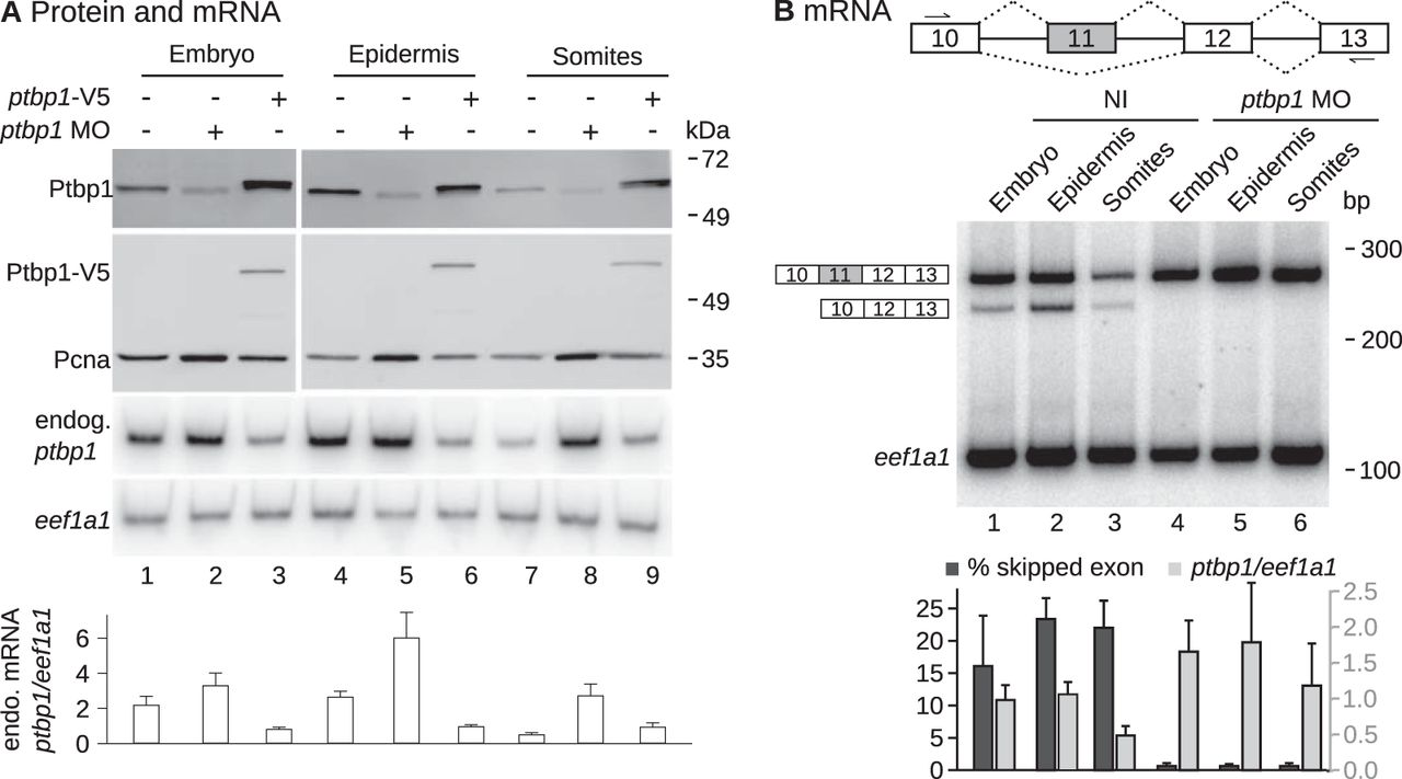 FIG 4 Self-regulatory feedback loop of ptbp1 expression in Xenopus epidermis. The ptbp1 MO or an mRNA encoding a V5-tagged version of Ptbp1 protein (ptbp1-V5 mRNA) was injected in both blastomeres of two-cell embryos. The embryos were allowed to develop until stages 28 to 30. The epidermis and the somites were dissected, or the embryos were left intact before protein and RNA extractions. (A) From top to bottom, Western blots using antibodies against Ptbp1, the V5 tag, and Pcna (loading control); results of one representative semiquantitative RT-PCR experiment using primers targeting eef1a1 and ptbp1 mRNAs, where the reverse primer targets the 3Ⲡuntranslated region of endogenous (endog.) ptbp1 mRNA (exon 15) and does not amplify the injected recombinant mRNA; and quantification of the ptbp1/eef1a1 mRNA ratios (mean ± SD from 3 independent experiments). (B) (Top) Schematic drawing of ptbp1 pre-mRNA. Exon 11 is either spliced or skipped. The arrows reveal the positions of the PCR primers (forward primer in exon 10 and reverse primer in exon 13). (Middle) Results of a representative semiquantitative RT-PCR. (Bottom) The percentage of ptbp1 mRNA excluding exon 11 (dark gray, ptbp1 mRNA without exon 11/total ptbp1 mRNA) and the total ptbp1/eef1a1 mRNA ratios (light gray) from 3 independent experiments (mean ± SD). |