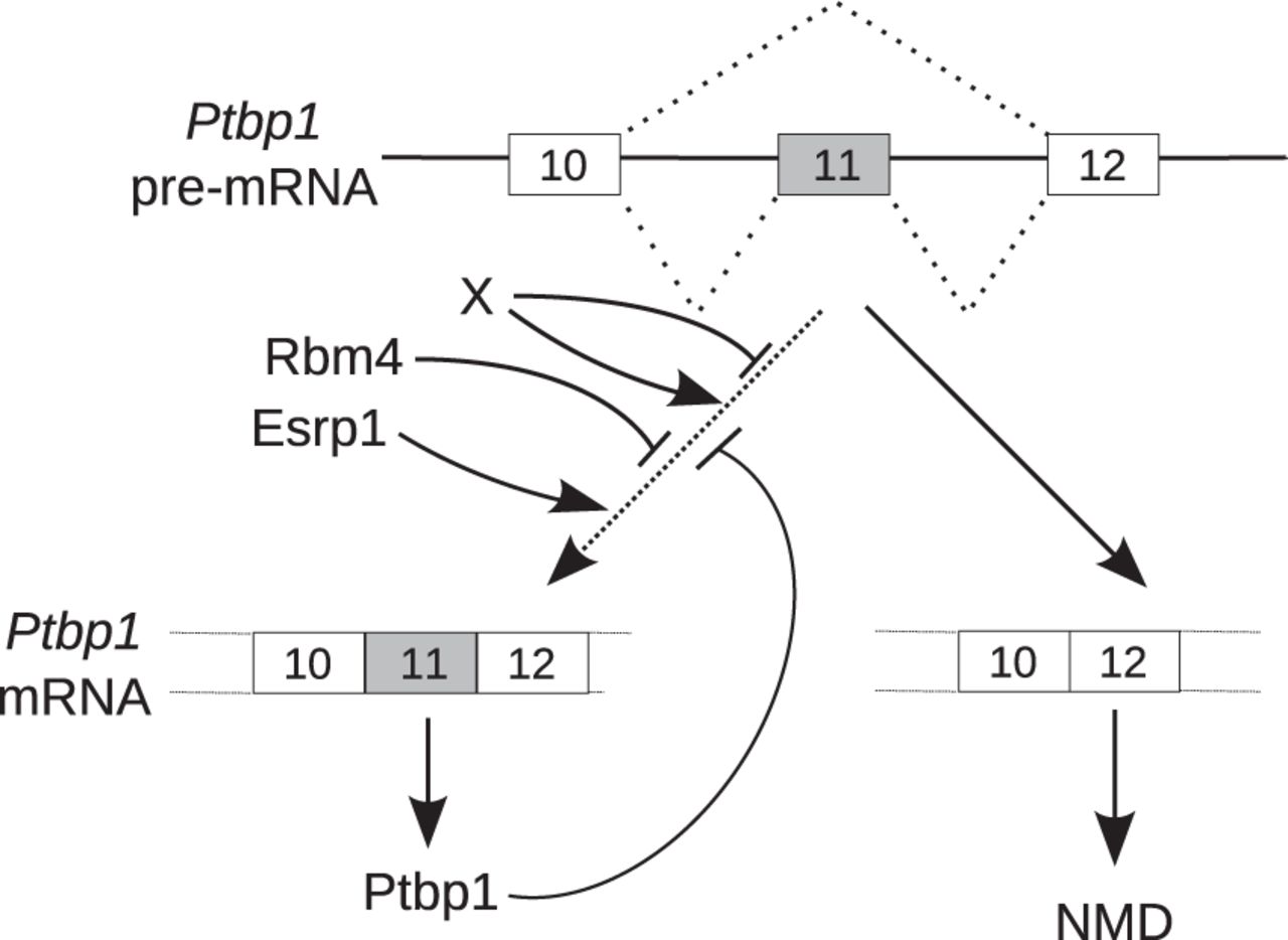 FIG 7 Model for the control of Ptbp1 abundance. The ptbp1 pre-mRNA matures into two isoforms differing by the presence of exon 11. The isoform devoid of exon 11 (right) contains a premature stop codon and is targeted to rapid degradation by NMD. The isoform containing exon 11 (left) is translated into the Ptbp1 protein. Exon 11 is spliced with a low efficiency, and Esrp1 is required to achieve exon 11 inclusion and, thereby, Ptbp1 accumulation in the epidermis. Ptbp1 counteracts Esrp1 to favor exon 11 skipping, which provides the basis for the ptbp1 self-regulatory feedback loop. Rbm4 also reduces exon 11 inclusion in muscle, heart, and, potentially, other tissues. Additional unknown trans-acting factors X may stimulate exon 11 splicing or skipping. |