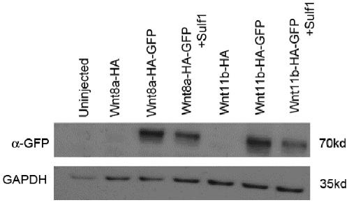Figure 4 Expression of Wnt8a-GFP and Wnt11b-GFP in Xenopus animal caps. Western blot analysis of Xenopus embryos injected with 400ng of mRNA coding for Wnt fusion proteins (Wnt8a-HA-GFP or Wnt11b-HA-GFP) together with 4ng of mRNA coding for Sulf1 or the control LacZ. Wnt proteins are detected at similar levels in the presence and absence of Sulf1. |