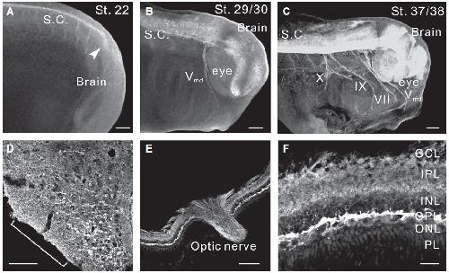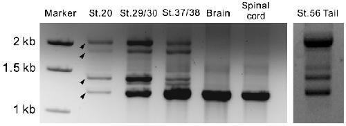 from stage (st.) 20, 29/30, 37/38, juvenile frog brain, spinal cord or st. 56