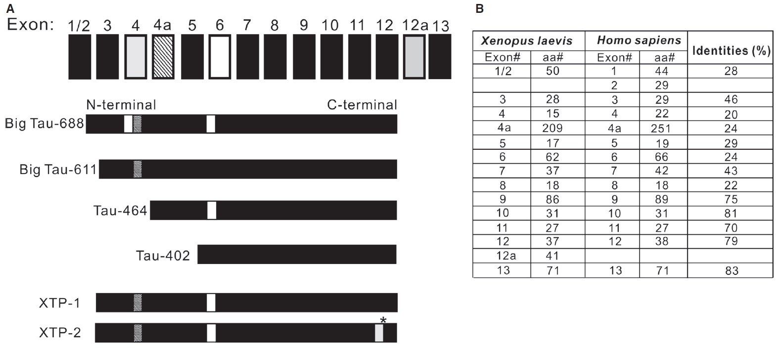 [Identities (%)] as well as the number of amino acids (aa#) encoded for each exon of X. laevis and human tau.
