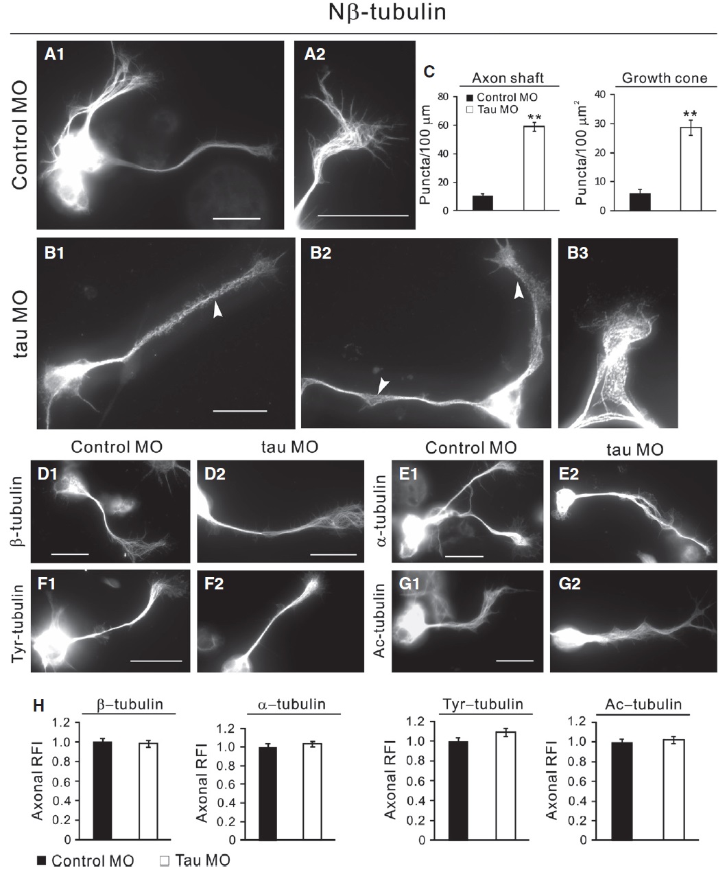 (D1 and 2), ubiquitous a-tubulins, Tyr-tubulin (F1 and 2) and Ac-tubulin (G1 and 2) differed between tau MO and control MO cultured neurons. Scale bars