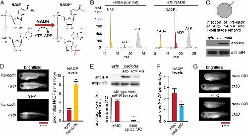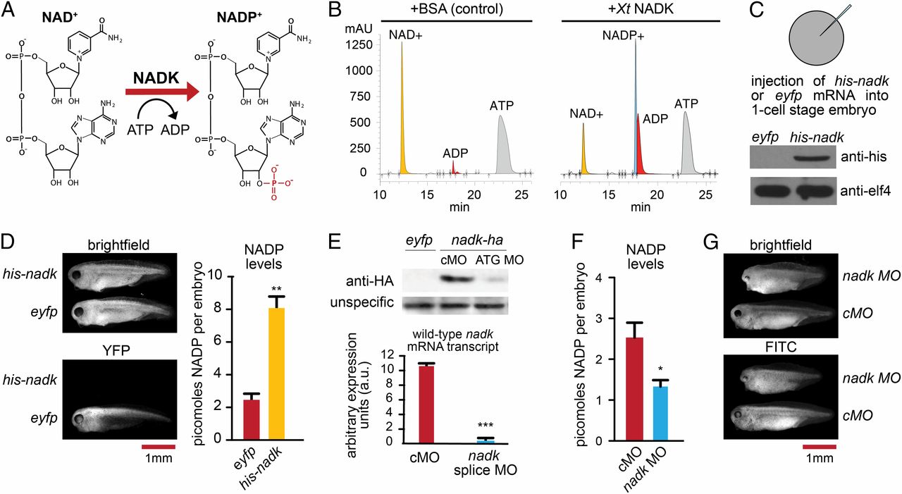 Fig. 1. Nadk controls NADP biosynthesis in vivo. (A) Schematic diagram showing the generation of NADP+ from NAD+ via NAD kinase. (B) HPLC chromatograms showing the generation of NADP+ from NAD+ and ATP in the presence of purified recombinant XtNADK versus BSA as control. mAU, milliabsorbance units. (C) Schematic diagram of 6xhis-nadk overexpression experiments and immunoblot detection of 6xhis-XtNADK in NF St. 26 embryo extracts. (D, Left) Representative bright-field and fluorescent images of 6xhis-Xtnadkâ and eyfp-expressing embryos. 6xhis-Xtnadk overexpressing embryos showed no overt morphological phenotypes versus controls. (Right) Bar graph showing NADP measurements from 6xhis-Xtnadkâ or eyfp-overexpressing embryos (n = 3). (E) Validation of morpholino-mediated loss-of-nadk function experiments. (Top) Western blot analysis showing how the nadk atg morpholino (ATG MO) results in a marked reduction but not complete loss of nadk-ha expression following coinjection. (Bottom) Bar graph showing RT-qPCR results verifying the loss of the endogenous wild-type nadk mRNA transcript following injection of the nadk splice morpholino (n = 3). cMO, control morpholino. (F) Bar graph showing NADP measurements from control or nadk morpholino-injected embryos at NF St. 26 (n = 4). (G) Bright-field and fluorescent images of embryos injected with control or nadk-suppressing FITC-labeled morpholinos. Embryos injected with Nadk-suppressing morpholinos showed a shorter body axis at NF St. 35. Error bars indicate SD. *P < 0.05; **P < 0.005; ***P < 0.001 (t test).