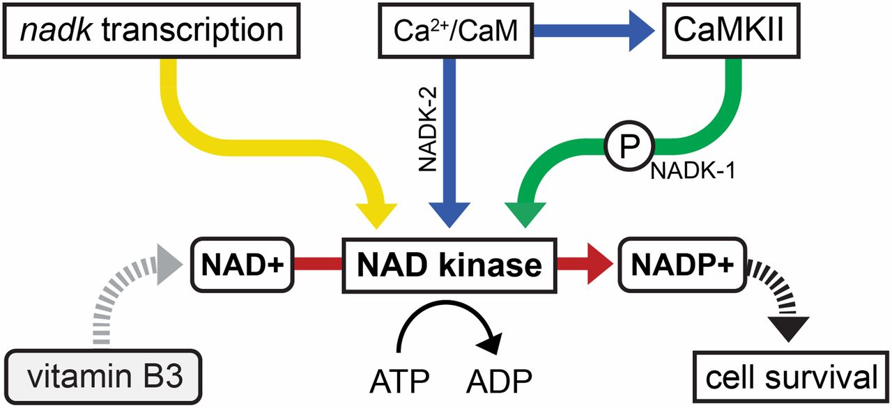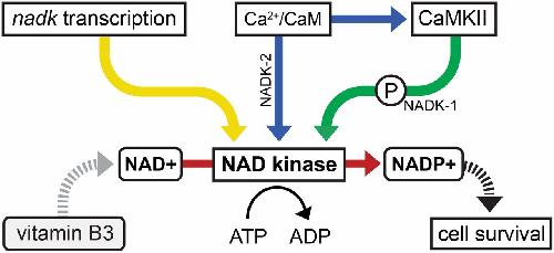 Fig. 4. Model of animal NADP biosynthesis. Animal NAD kinases catalyze the conversion of NAD+ to NADP+ using ATP as phosphoryl donor. NADP production is essential for cell survival and is regulated by several mechanisms on different levels. Transcription of the NADK gene directly regulates cellular NADK activity and production of NADP+. Availability of the reaction substrate NAD+ influences NADP+ production, and is in turn dependent on NAD+ synthesis from vitamin B3 precursors. Calcium and calmodulin provide yet another mechanism to regulate NAD kinase activity. In sea urchins, the two NADK isoforms identified in this study are regulated by Ca2+/CaM via different mechanisms: NADK-1 (also found in vertebrates) is phosphorylated by CaMKII, whereas NADK-2 is directly regulated by Ca2+/CaM binding, resulting in increased NADK activity.