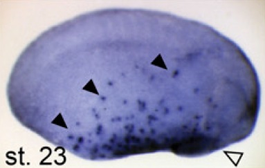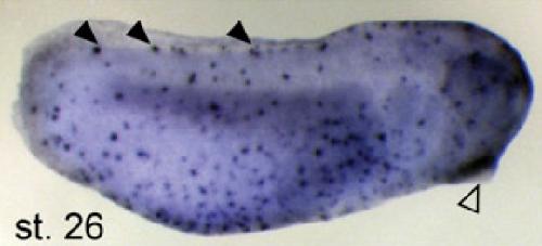 nadk (NAD kinase) gene expression in Xenopus laevis embryo, assayed via in situ hybridization, NF stage 26, lateral view, anteriorright, dorsal up.