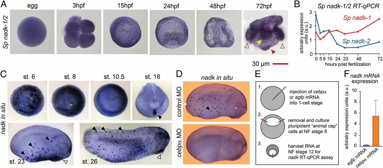 Fig. 2. Tissue-specific expression of nadk during sea urchin and frog development. (A) Images show in situ hybridization reactions recognizing S. purpuratus nadk expression during development. Open red arrowheads indicate the ciliary band. The closed red arrowhead points to cells in the aboral ectoderm of the pluteus that constitute the vertex structure. The yellow arrowhead points to the gut. hpf, hours postfertilization. (B) RT-qPCR expression profiling of Spnadk-1 and Spnadk-2 during S. purpuratus embryonic development. (C) Images of in situ hybridization reactions recognizing X. tropicalis nadk expression during various stages of development (16). Closed black arrowheads indicate primitive myeloid cells. Open black arrowheads point to the cement gland. (D) Expression of nadk following injection of cebpα morpholino, a loss-of-function technique that removes PMCs from the embryo (16). The black arrowhead indicates a PMC. (E) Schematic diagram outlining the experimental procedure of ectopically inducing PMC development in X. tropicalis animal caps using the injection of cebpα mRNA (16). (F) Expression of nadk in cebpα or egfp mRNA-injected animal caps as detected by RT-qPCR (n = 3). Error bars indicate SD of three independent experiments.