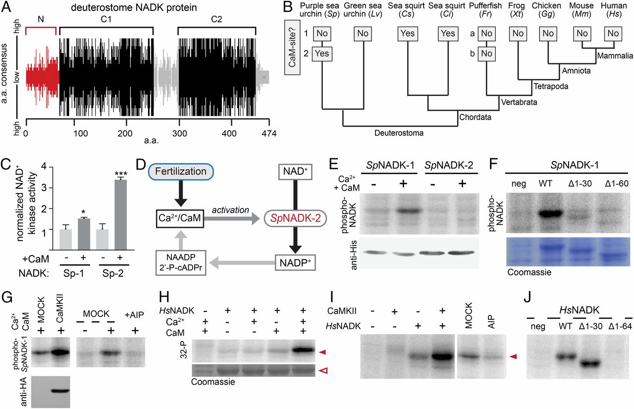Fig. 3. Evolutionarily divergent and conserved Ca2+/calmodulin-dependent modulation at the N terminus of NAD kinase. (A) Graphical representation of the amino acid (a.a.) conservation of NADK among the deuterostomes listed in B. The y axis shows conservation (greater height indicates greater conservation). The relatively low conservation of the N termini is highlighted in red. (B) Phylogenetic relationship between the deuterostome species examined. The presence of predicted CaM binding sites (Fig. S3A) is indicated. (C) Effect of Ca2+/CaM exposure on the NAD+ kinase activity of SpNADK-1 and SpNADK-2 proteins. Error bars indicate SD. *P < 0.05; ***P < 0.001 (t test). (D) Proposed feedback loop underlying the increase in NADP following sea urchin fertilization [NADP+-derived NAADP and 2â²-phospho-cyclic ADP-ribose (2â²-P-cADPr) are potent intracellular activators of Ca2+ release (1, 2)]. (E) Autoradiograph demonstrating in vitro phosphorylation of SpNADK proteins using 32P-labeled ATP and HeLa cell extracts. The 6xHis immunoblot confirms equal loading. (F) Ca2+/CaM-mediated phosphorylation of SpNADK-1 wild type and N-terminally truncated mutants. (G, Left) Autoradiograph and immunoblot of in vitro phosphorylated recombinant SpNADK-1 using extracts from HeLa cells overexpressing HA-CaMKII. (Right) Autoradiograph of purified SpNADK-1 incubated with Ca2+/CaM and extracts from HeLa control cells (MOCK) or cells overexpressing the CaMKII autoinhibitory peptide (AIP). (H) Ca2+/CaM-dependent in vitro phosphorylation of HsNADK using HeLa cell extract. (I) In vitro phosphorylation of HsNADK by extracts from HeLa cells expressing HA-CaMKII (Left) or autoinhibitory peptide (Right). Closed red arrowheads indicate the phosphorylated HsNADK (autoradiographs). The open red arrowhead indicates the Coomassie-stained HsNADK. (J) In vitro phosphorylation as in H of HsNADK WT and N-terminally truncated mutants.