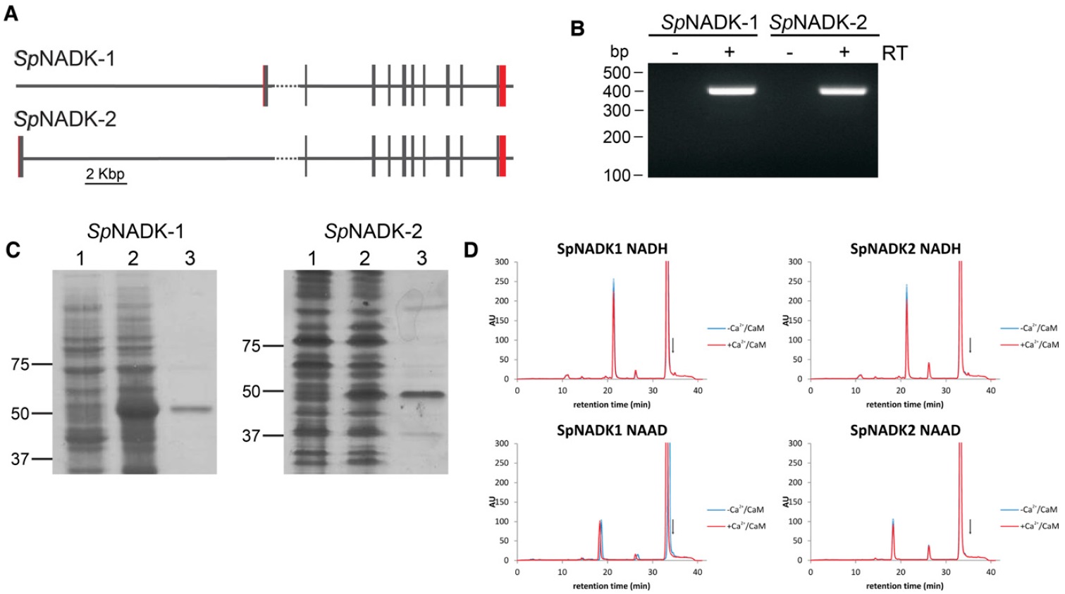 Fig. S2. Cloning, expression, and activity measurements of S. purpuratus NADK-1/2. (A) Putative genomic organization of the SpNADK gene. Schematic
