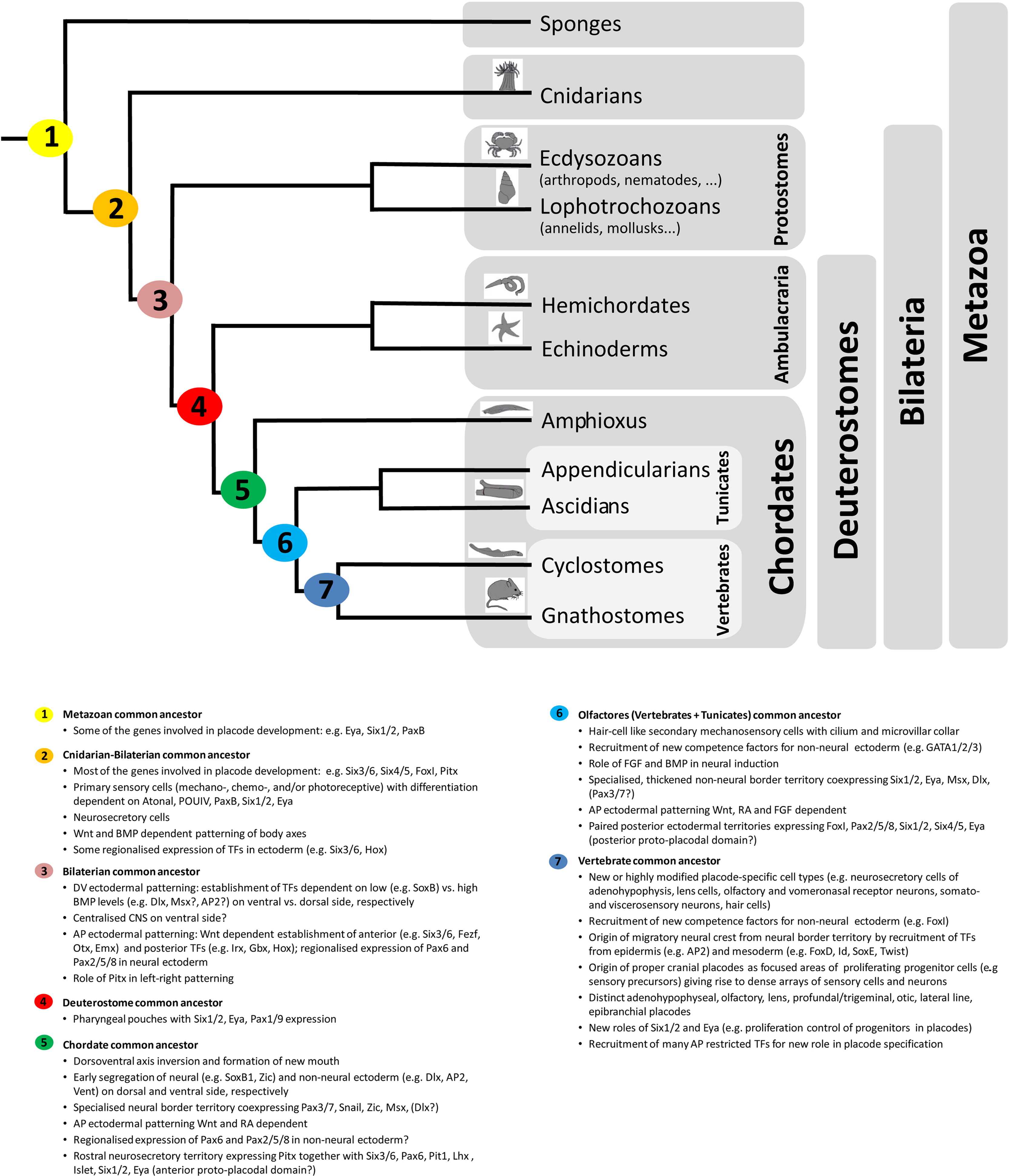 Key steps in placode evolution. Evolutionary changes of ectodermal patterning mechanisms and origin of new cell types are mapped onto the phylogenetic tree of metazoans. Important nodes are numbered and the key depicts which characters can be traced to each node. Character origination events whose placement on the tree is controversial are indicated by a question mark. AP: anteroposterior; DV: dorsoventral; TF: transcription factor.