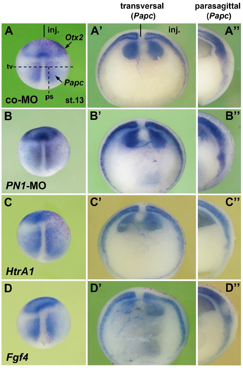 Figure S9. PN1-MO, HtrA1, and FGF4 do not induce ectopic Papc expression in the ectoderm of post-gastrula embryos. Embryos were animally injected into a single blastomere at the 4-cell stage with nlacZ mRNA as a lineage tracer (red nuclei) and processed for whole-mount in situ hybridization for Otx2 and Papc. (A-Aââ) Embryo injected with 15 ng control-MO. Strippled lines in dorsal view of neurula embryo indicate section planes. Note Papc expression in transversally sectioned trunk mesoderm (Aâ) and parasagitally sectioned tailbud mesoderm (Aââ). (B-Dââ) PN1-MO (15 ng), HtrA1 mRNA (50 pg), and Fgf4 mRNA (0.5 pg) shift the Otx2- Papc border anteriorwards (B-D), but fail to induce ectopic Papc expression in the overlying ectoderm on the injected right side (Bâ-Dââ). The frequency of the indicated phenotypes was A, 79/79; Aâ+Aââ, 4/4; B, 47/57; Bâ+Bââ, 13/13; C, 93/97; Câ+Cââ, 8/8; D, 12/13; Dâ+Dââ, 8/9. |