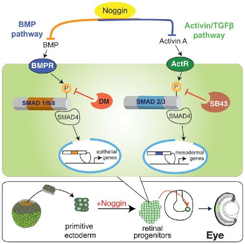DM and SB43 inhibit activation of Smads by BMP and Activin receptors, respectively. In both pathways, gene transcription fails to drive epithelial or mesoderm specifying genes, which allows primitive ectoderm to take on a retinal progenitor cell fate.