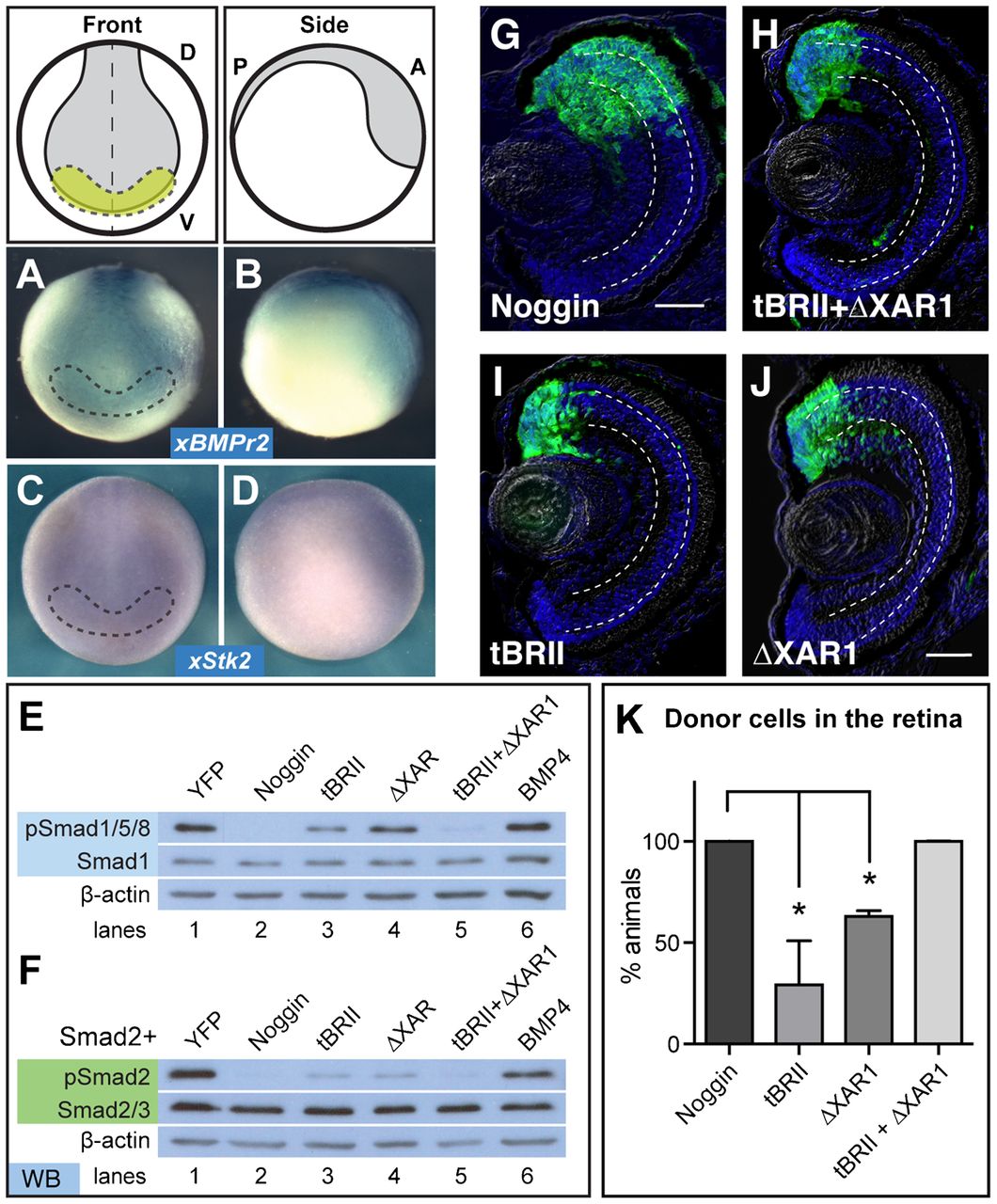 ng) receptors individually suppress pSmad1/5/8, but signaling is repressed further with expression of both tBRII+δXAR1. (F) pSmad2 is also repressed with the expression of both tBRII and δXAR1. (GâK) Using the ACT assay, the tBRII+δXAR1-expressing cells end up in the retina more frequently than either the tBR or δXAR1-expressing pluripotent cells. Scale bar, 50 µm. Dashed lines lie on outer and inner plexiform layers. (K) ACT results quantified and statistics determined using a student's t-test, Nâ=â2. Error bars â=â±s.e.m.; *p<0.05. Green, YFP; blue, DAPI staining. Dorsal âDâ, ventral âVâ, posterior âPâ, anterior âAâ.